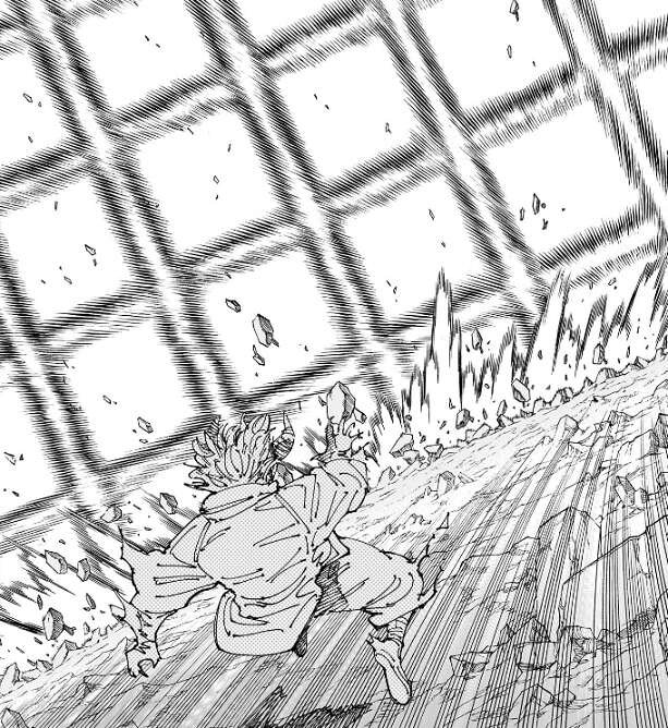 次は日車と虎杖のタッグが参戦です。一緒に出てきたので二人でタッグを組んで闘うのでしょうが、どのように戦うのかは不明です。おそらく日車の領域展開「誅伏賜死」で宿儺を攻略しようと考えている可能性が、今のところ高いのかな?と考えています。ただ、今の宿儺に「誅伏賜死」が通用するかというと、ちょっと難しいような気がしますが…。そして、虎杖の腕と爪がおかしくなっている気が…、気のせいでしょうか?