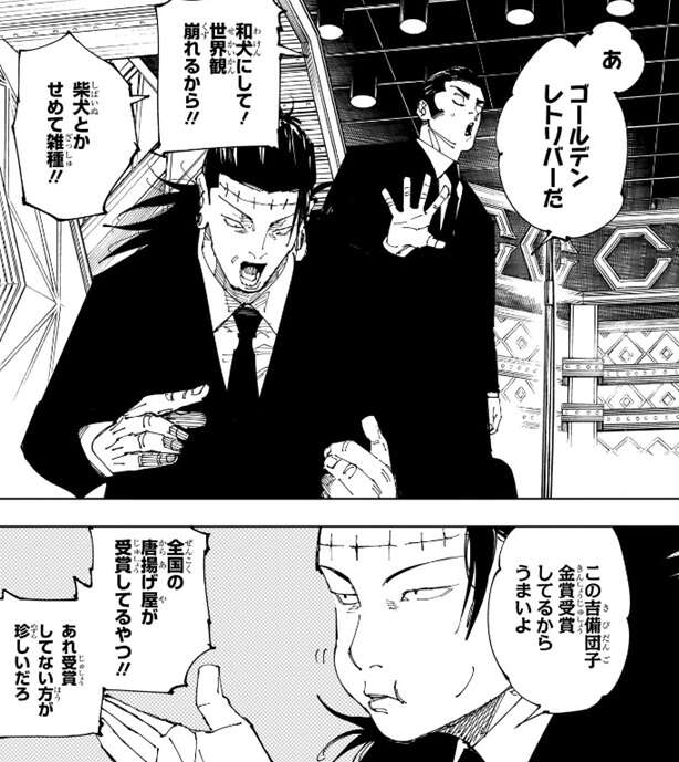 桃太郎のお供を和犬でなくゴールデンレトリバーにしたり、吉備団子が金賞を受賞していたり、鬼ヶ島にキャンセルの電話を入れたり、と羂索が桃太郎の世界観を崩すボケを連発し、羂索がボケまくります。