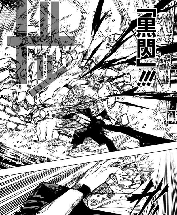 宿儺は投げ飛ばされた柱を斬撃でバラバラにすると、柱の残骸を虎杖の方に蹴って飛ばします。虎杖は宿儺の足を掴み、さらに宿儺を殴ろうとしますが、宿儺は斬撃を虎杖に飛ばし攻撃を阻止しようとします。しかし虎杖は飛んでくる斬撃を無視して、さらに打撃を加え宿儺に黒閃をきめます。宿儺は虎杖の斬撃を、なんとも間抜けだな、と表現し、覚えたてで出力も低く今のこの当て勘(黒閃の事?)の方が余程厄介だ、と心の中でつぶやきます。