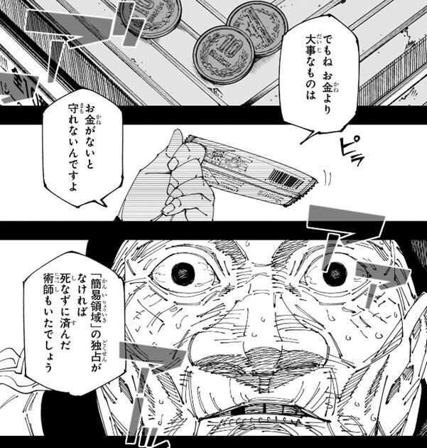 門弟から寿命を吸い上げてまで見たい景色があったんでしょう?まさに金には替えられない大きな野望だ、そして今禪院家が壊滅し、今回の決戦で加茂家と五条家が共倒れすれば……、と冥冥は当主が門弟から寿命を吸い上げてまで叶えたかった野望を代弁します。しかし、お金より大事な物はお金がないと守れないと冥冥は言い、「簡易領域」の独占がなければ死なずに済んだ術師もいたでしょう、と言うと当主は恐怖のあまり顔面から汗を拭きだします。