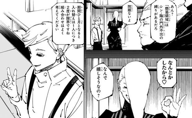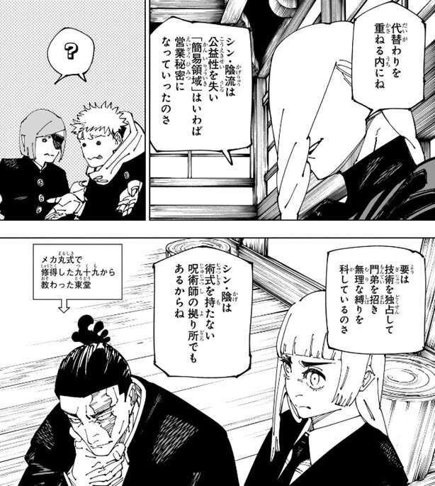 冥冥は楽したという日下部の指摘に、冥冥は否定はしません。秤がシン・陰の事で冥冥が働いたのは、「簡易領域」の門外不出の縛りの件か?と、聞くと、日下部が「簡易領域」の縛りを説明します。「簡易領域」の一門相伝の縛りは、元々蘆屋貞綱によって呪詛師への技術流出を防ぐ為に作られたと日下部が説明すると、代替わりを重ねる内にシン・陰流は公益性を失い、「簡易領域」はいわば営業秘密になったと冥冥が加えて説明します。要は技術を独占して門弟を招き、無理な縛りを科していたそうです。