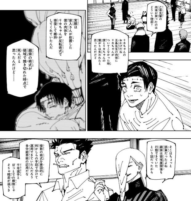 すると、乙骨はリカのおかげだと言います。五条乙骨になった時、リカがついてこなったので乙骨とリカの繋がりはなくなっていたと思われましたが、実際は家入が処置した乙骨の肉体をリカが反転術式で修復、維持していたそうです。乙骨は羂索の術式が領域で焼き切れた時点で死んだと思っていたそうです。日下部は、複数の術式を意図的に何かしらの手段で分けて運用できていたんだろう、多分結界術の応用だな、と推測し、千年選手とぽっとでの模倣(コピー)じゃそりゃ精度が違うさ、と言います。乙骨も、術式が回復した後に仮死状態の僕と外付けの術式であるリカちゃんが再接続してなんとか現在に至ります、と虎杖達に説明します。ご心配おかけしました……、と虎杖達に謝りますが、真希はそんな話はどうでもいいんだよ、と言います。問題は憂太がちゃんと立ち回っていればもっと楽に勝ててたんじゃねぇかって話だよ、と真希が言うと、乙骨はギクと汗を流します。
