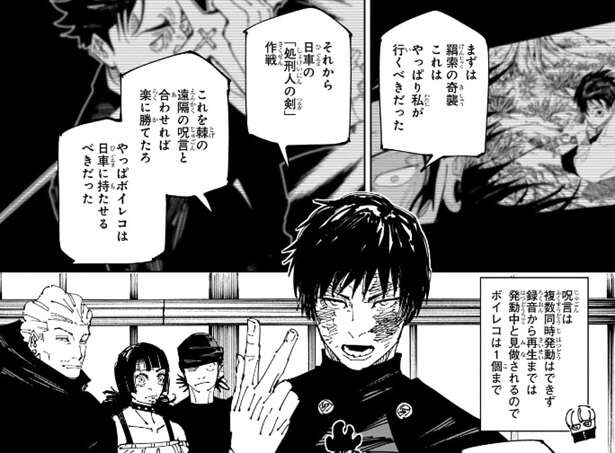 真希は、まずは羂索への奇襲は自分が行くべきだったと言います。さらに、日車の「処刑人の剣」作戦は、狗巻の遠隔の呪言と合わせれば楽に勝てたろ、と真希は言い、狗巻のボイレコは日車に持たせるべきだったと主張します。狗巻の呪言は複数同時発動が出来ず、録音から再生までは発動中と見做されるので、ボイレコは1個しか用意できないようです。しかし東堂は真希が自分の「不義遊戯」の術式対象にならず、乙骨でも東堂の補助なしで奇襲を成功させられたかというとかなり際どいと言います。さらに呪霊操術の暴走を食い止めるのは乙骨とリカの力が必要だったと、真希の主張に反論します。