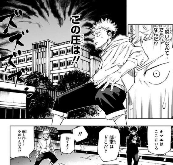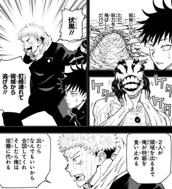 少年院の内部に入った三人ですが、釘崎は別の場所へと飛ばされて、虎杖と伏黒は変態を遂げた特級呪霊と対峙することになります。伏黒の犬の式神・玉犬は倒され、虎杖は左腕を特級呪霊に斬り落とされてしまいます。絶体絶命の状況に陥った虎杖は、伏黒に釘崎を助けてこの領域から脱出するように言い、二人が脱出するまで特級呪霊を足止めしようとします。