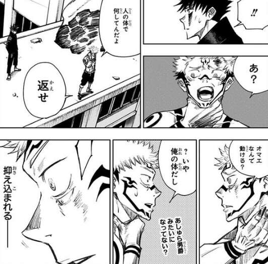 虎杖は先輩達を助けようとしますが、苦境に追い込まれてしまい、強い呪力を得るため虎杖は呪物を飲み込みます。その結果、特級呪物・両面宿儺が虎杖の肉体に受肉してしまい、もう人間ではない、と虎杖は伏黒に言われてしまいます。