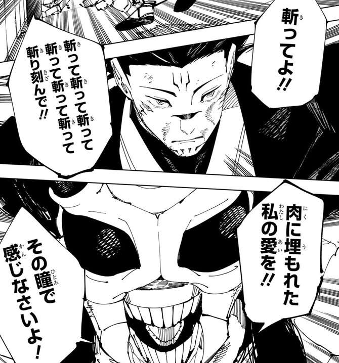 万は平安時代の出来事を思い出しながら、宿儺を殺して宿儺の孤独を独り占めしたいと考えます。万は構築術式で「完全な球体」、「真球」を作り出し、さらに領域展開「三重疾苦(しっくしっくしっく)」を使用します。万の領域には、触れることが出来ない「真球」が必中効果として付与されており、このままでは「真球」による無限の圧力で宿儺は消えてしまいます。領域・三重疾苦に対抗するために宿儺が伏魔御廚子を使うと万は思っていましたが、領域を展開しない宿儺に万は驚きます。そして、宿儺は伏魔御廚子でなく八握剣異戒神将魔虚羅(やつかのつるぎいかいしんしょうまこら)を召喚します。