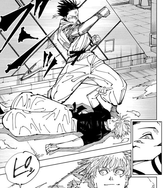 第221話で復活した五条に挑んで吹っ飛ばされた裏梅です。裏梅がギャグマンガみたいにビルにめり込んでいますが、一応死んでいません。