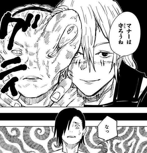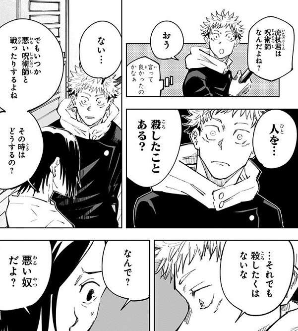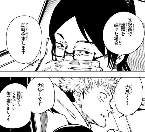 真人は吉野に呪霊の事や、自分が呪術で人間の体の形を変えて実験している事を教えます。吉野は自分をいじめていた者に復讐を考えていましたが、真人は、順平の全てを肯定するよ、と言い吉野の考えを肯定します。一方、虎杖は七海と別れて吉野の調査を任されます。吉野が呪いを視認できるか、呪術を使えるか、「蠅頭」を使って確認しようとします。