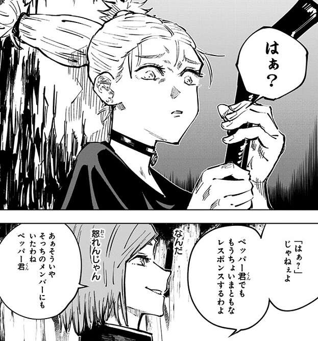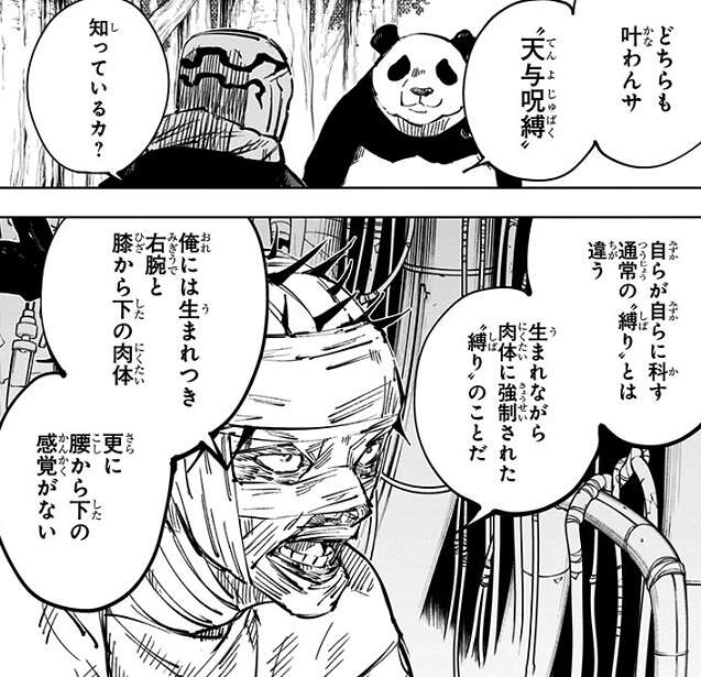 パンダはメカ丸に、仲良くやろうぜ 呪骸同志(おなかまどうし)、と話しかけますが、呪骸扱いされたメカ丸はパンダに恨みの感情をぶつけます。メカ丸は生まれながら肉体に強制された“縛り”を持つ“天与呪縛”の持ち主で、人型ロボットの傀儡を操る術師でした。“天与呪縛”のせいで日の下を歩けないメカ丸にとって、呪骸のパンダがのうのうと日の下を歩いている事が許せず、メカ丸はパンダに嫉妬と苛立ちをぶつけながら攻撃します。