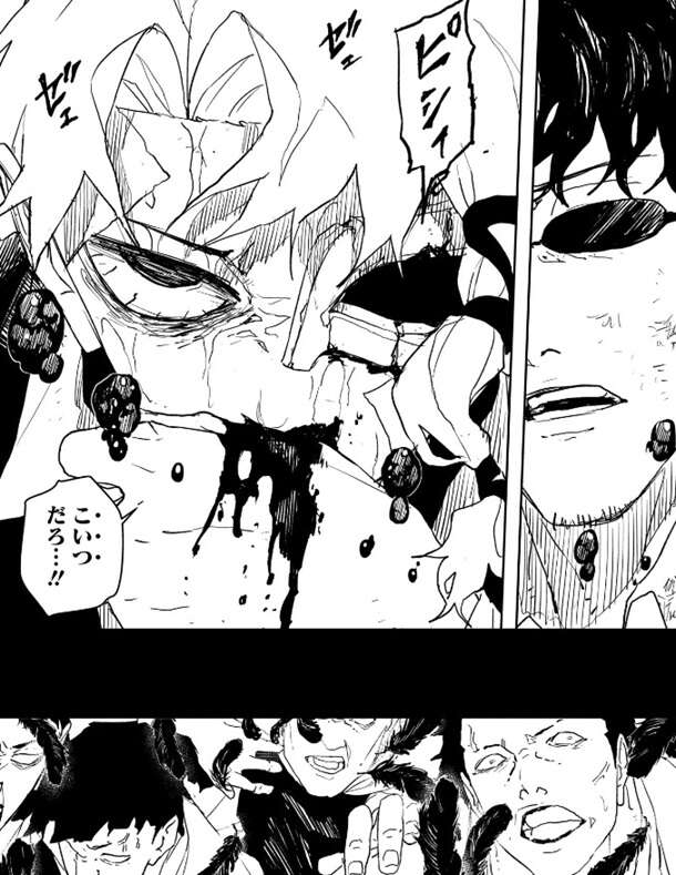 毘灼の幹部が生やした松が建物を破壊した影響で、建物が限界にきて崩壊を始めます。毘灼の幹部は、先に建物の限界が来たか、こっちも終わらせよう!と言うと、敵の妖術師がさらに襲い掛かってきます。一方、座村は轟音と硝煙で感覚が機能しなくなっていて、視界で最も光るのは“殺気”、座村はその殺気という灯に斬りかかっていました。そして座村はこの混沌の中一際輝く灯に、座村の殺意は導かれて、そちらへと移動し斬りかかります。