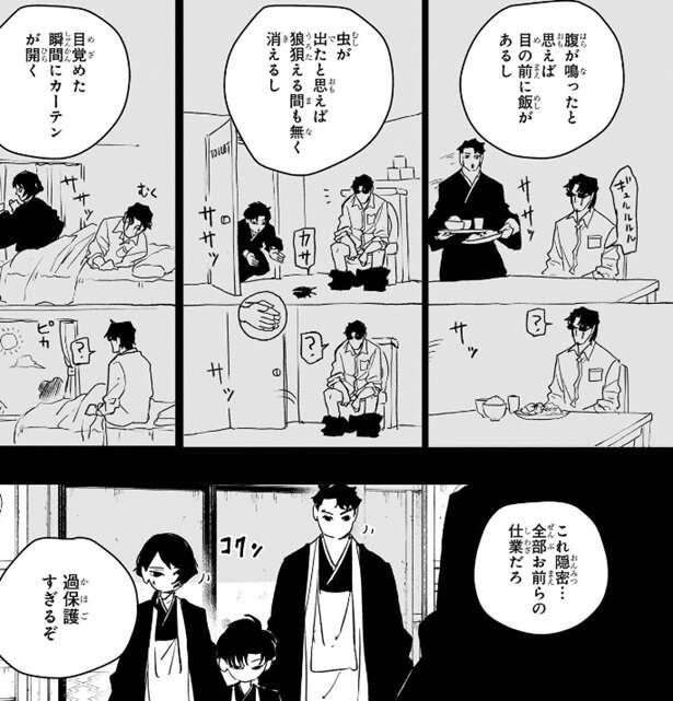 座村は妖刀を持っておらず妖術も使えないので護衛が必要で、そこは座村も理解していますが、巻墨の三人は座村と出会って二週間、飯の準備やトイレに出た虫の駆除、目覚めた時のカーテンを開ける動作、等を全て座村に気付かれないように隠密でやっていて、座村から過保護すぎると言われます。主の面倒を引き受けるのも私の仕事です、と巻墨が言うと、座村はやりすぎだと答えます。それでも巻墨は、忍に私情は無用、道具だと思ってくれていい、緊急時にはあんたの代わりに命を使う、と断言します。