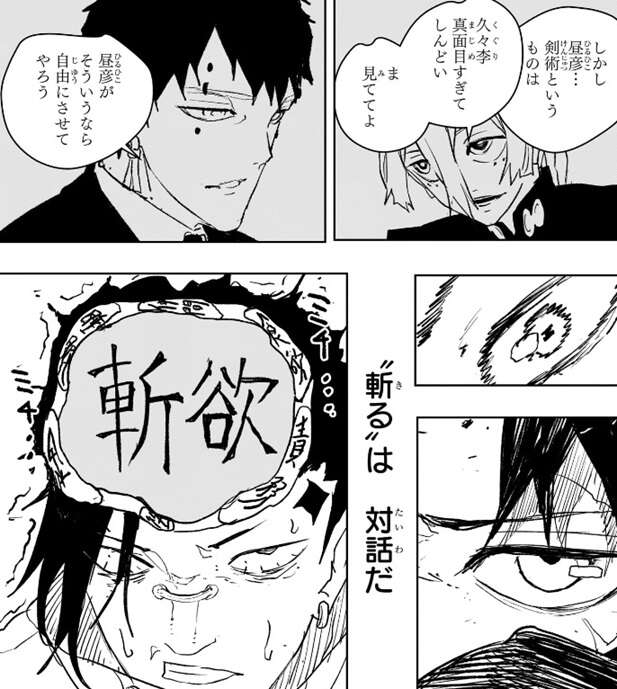 しかし久々李の頭には昼彦の、久々李、真面目過ぎてしんどい、ま、見ててよ、という会話や、幽の、昼彦がそういうなら自由にさせてやろう、という会話が蘇ります。さらに“斬る”は対話だ、という言葉とともに、久々李の斬欲が頭の中でどんどん膨らんでいきます。