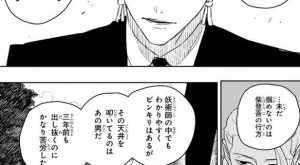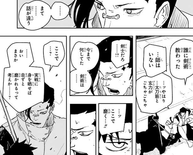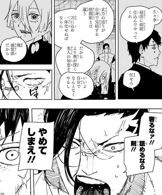 久々李の剣術を見た郎は、久々李は妖術を使っておらず玄力を伴う剣術のみでここまでの域に達している、熟練の域、と久々李の剣術の腕を分析します。久々李は“斬欲”を抑えつつチヒロと斬り合いますが、チヒロの剣術を見て何かを感じたのか、誰に剣術を教わったかチヒロに質問します。師はいないとチヒロが答えると、…ッやはり…太刀筋と玄力がごちゃごちゃ、剣士だろ……!?今まで何してた剣術は……、と久々李は言いますが、ここで剣術を磨くと言うチヒロに対して、ここで…?……おいまさか、実践に身をさらせば自ずと磨かれるって考えか……?と、久々李はあきれます。