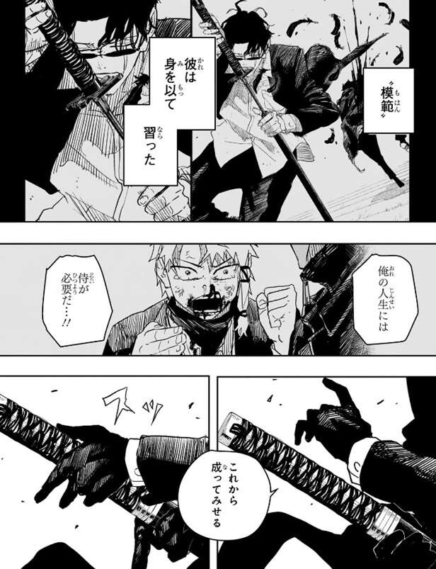 “模範”彼は身を以って習った、の文章と共に、座村に居合で斬られた時のカットが挿入されます。チヒロはハクリから、俺の人生には侍が必要だ…!!と、言われた時の事を思い出しながら、これから成ってみせると言うと、鞘に納められた刀を握ります。