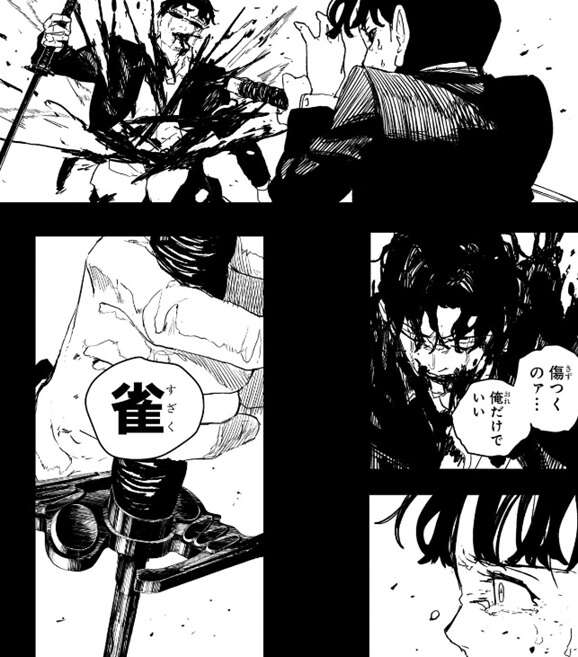 雀を使用すると体の傷の場所に火がつき、傷が治っていきます。その“火”は傷を種(くさ)にして灯るようですが、傷が治る以外の能力の詳細は現時点では不明です。チヒロと昼彦の場所には大量の黒い羽根が迫ってきますが、その大量の黒い羽根の中に座村がいて、活気がいいなぁ糞餓鬼、と昼彦に話しかけます。