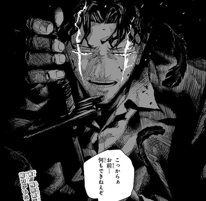 そして場面は座村が何本もの刀に貫かれた直後に戻りますが、刀に貫かれた直後操られていた死体が消えたように見えます。傷だらけの座村ですがイヲリに、傷つくのァ…俺だけでいい、と言うと飛宗の能力『雀(すざく)』を使用します。