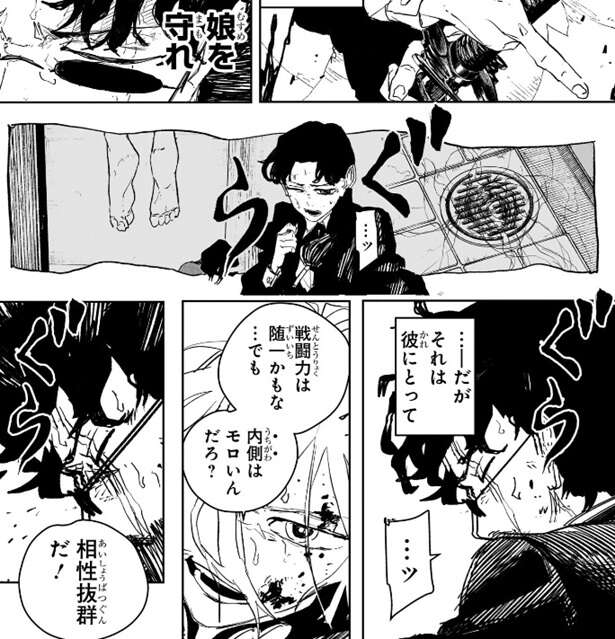 座村はイヲリの存在を忘れ、これまでは“剣聖を殺す”という強烈な使命感だけが彼を動かしていました。しかしイヲリを思い出し、娘を守ると言う具体的な原動力がここへきて補完されますが、イヲリを思い出した事で人一倍繊細な座村は娘が自殺する幻覚を見せられまともに戦えない状態になってしまいます。戦闘力では随一だが、内側はモロい座村と宴の能力は相性抜群だ、と昼彦は言います。