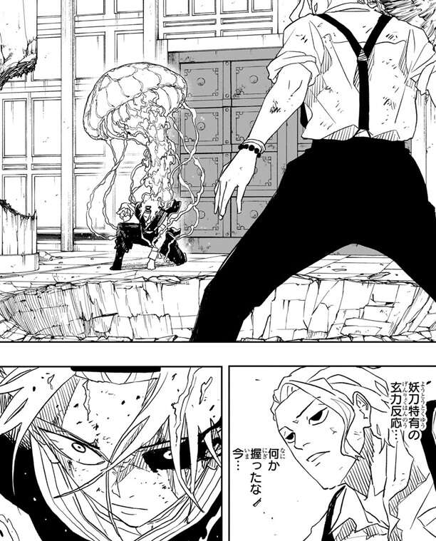 ハクリはチヒロに先に行くように言い、重傷の宗也と戦おうとします。チヒロは重傷とはいえハクリが宗也と戦うのは無茶だと思いつつ、ハクリの覚悟を感じてハクリに宗也を任せます。一方、濤の天理は雫天石を使用した結果、玄力が具現化、クラゲのような玄力反応が現れます。
