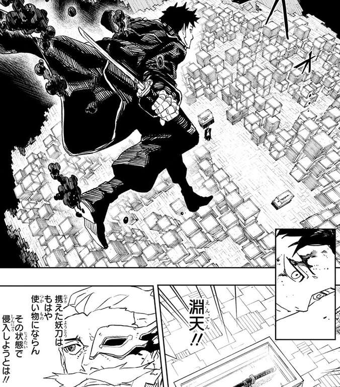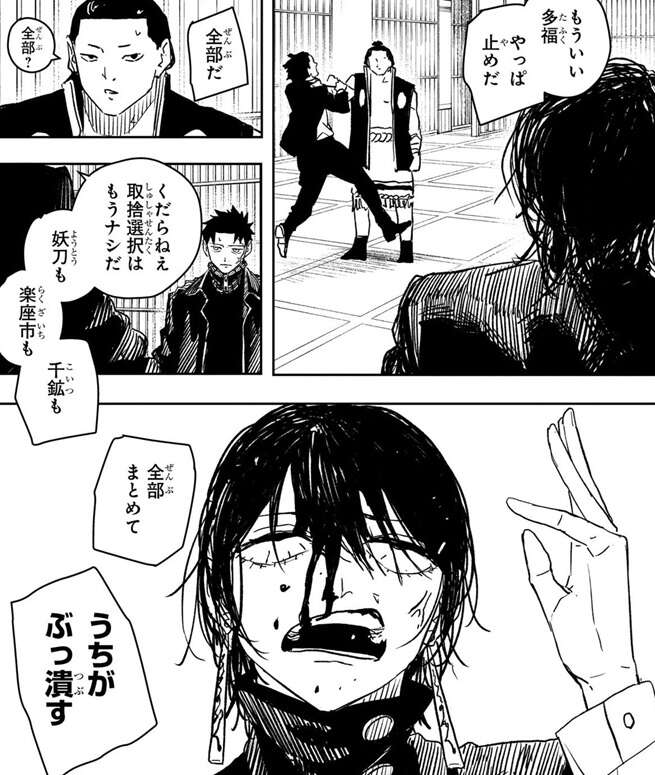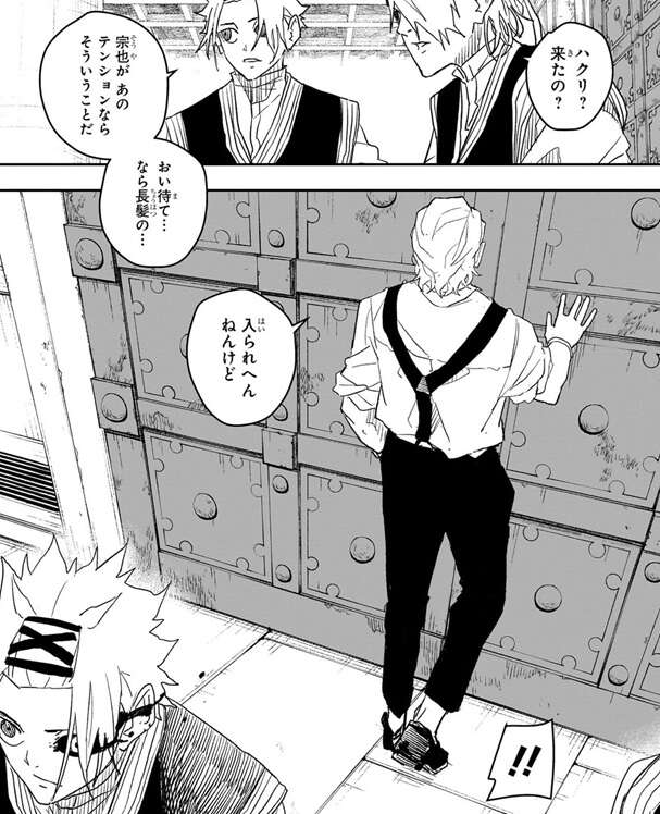チヒロは毘灼の統領を殺すよりもハクリとの合流を優先し、刳雲で木の壁を破壊しハクリと合流します。丁度、ハクリの威葬とチヒロの刳雲の突破が重なる形となり、宗也は大ダメージを受けます。一方、毘灼の統領の所に緋雪が現れ、炎骨を使用中の緋雪は臨戦態勢ですが毘灼の統領は緋雪には構わず逃走します。一方、扉を開けようとしていた柴はその場にいた濤を圧倒、濤のメンバーに扉の開け方を教えるように迫ります。