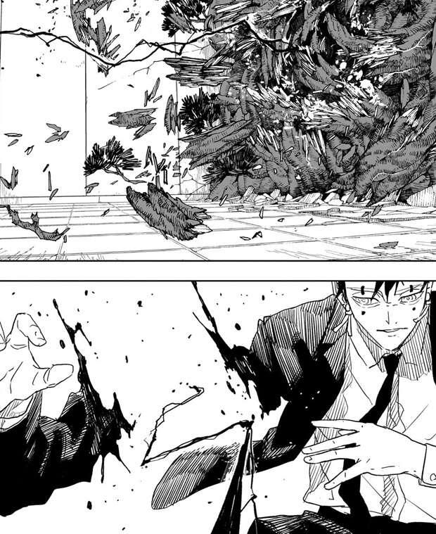 チヒロは刳雲の本領に触れたことにより刳雲は息を吹き返し、鳴・千を発動させ黒い雷を身に纏います。鳴・千を発動させた事で、チヒロは通常を遥かに上回る速度と攻撃力を発揮します。その状態でチヒロは毘灼の統領を攻撃、毘灼の統領の腕を引きちぎります。それでも毘灼の統領はチヒロの攻撃をわざと受けるほど余裕があり、同時に木の壁も深く抉りましたがすぐに修復されてしまい、ハクリと合流が出来ません。