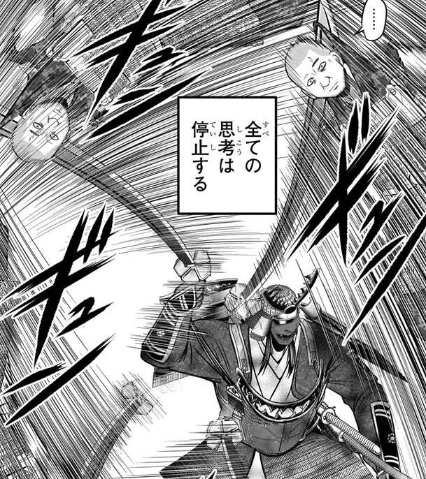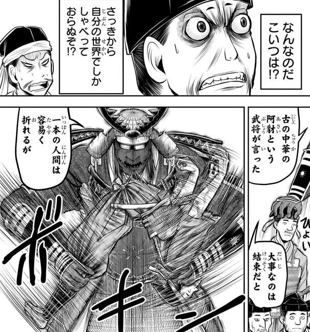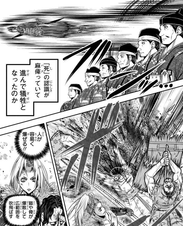 人間爆弾が顕家軍に着弾すると人がたやすく爆ぜて、鎧や骨が爆散すると顕家軍の堅い防御を広範囲に吹き飛ばします。土岐が部下を人間爆弾として顕家軍に投げ続けた結果、顕家軍本陣の陣形が崩れ顕家本人は重傷を負ってしまいます。