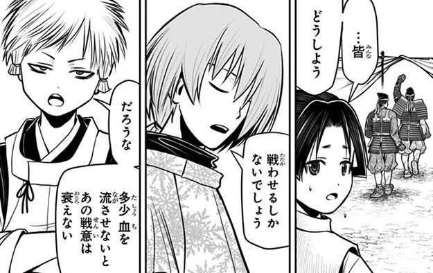 妻子が全員、安全圏に逃げた事を確認した時行と保科は、全軍に撤退を開始させます。時行と保科とわずかな兵が残って殿を勤めて敵を引き付けますが、国司は敵が逃げ出したのを知り、護衛は必要ないから敵を追いかけて戦って来いと市河に命じます。吹雪は市河の軍が国司の護衛から離れる事を予想し、川中島の朝霧に身を隠して国司を直接狙います。