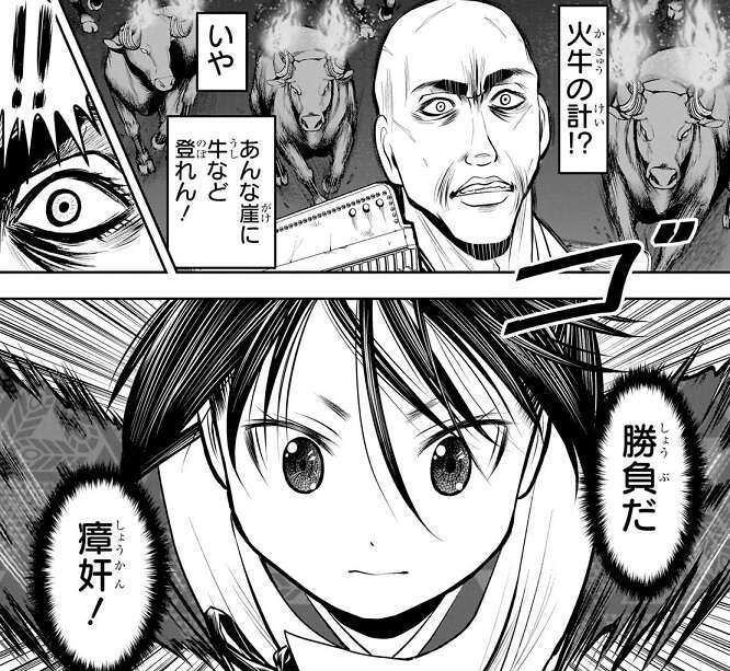 北条時行の作戦・火牛の計により、瘴奸の軍は火と丸太で寸断され混乱の極みとなり、さらに丸太から降りた北条時行の兵が瘴奸の兵を討ち取り、一気に勝敗は決します。瘴奸は逆転するのは不可能と悟り、一旦退却すると見せかけて北条時行を誘い出します。瘴奸は北条時行と会話をする中で楠木正成と出会い、成長したと分かると、瘴奸ではなく武士・平野将監として全力をもって相手する、と北条時行に伝えます。