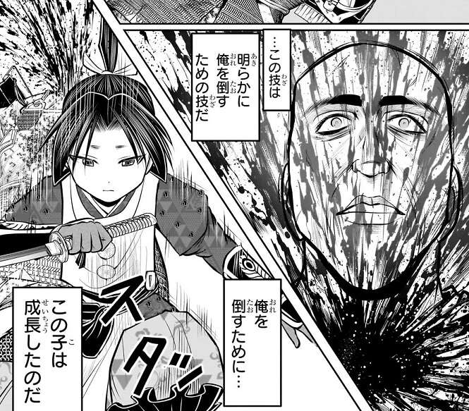 鎧、二刀、脚、フェイント、眼などあらゆる技術で北条時行と吹雪の攻撃を封じる将監に、北条時行には付け入る隙がありませんでした。そこで北条ときゆき は吹雪が考えた必殺技・二牙百刃で、将監の隙を作りつつ北条時行は将監の喉を突き刺し将監に致命傷を負わせます。将監は最後に自分が治めている村の子供の言葉を思い出しながら、ああ、死にたくない、と心残りを感じつつ絶命します。