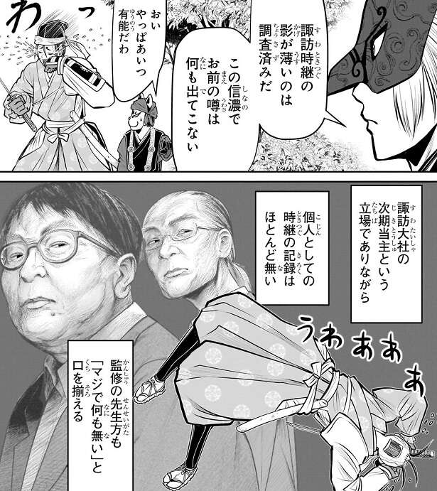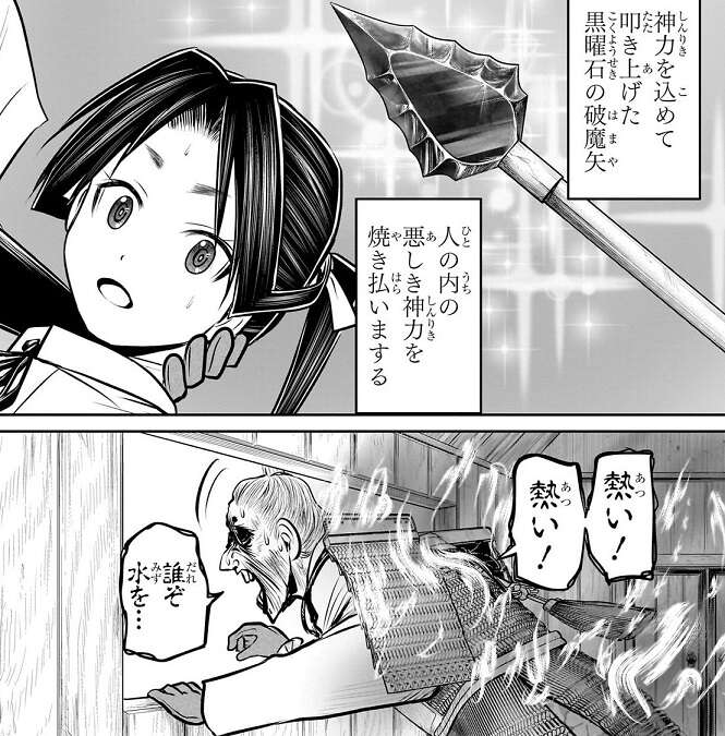 諏訪時継は影の薄さを利用して姿を隠し、風間玄蕃と協力して天狗を捕らえることに成功します。一方、北条時行は神力を込めて叩き上げた黒曜石の破魔矢を国司に打ち込みます。神力が込められた黒曜石の破魔矢で傷つけられたことで、内にある悪しき神力を焼き払われ国司は悶え苦しみます。戦車から首を出した所を保科弥三郎に狙われ、最後は首を斬られて討ち取られてしまいます。