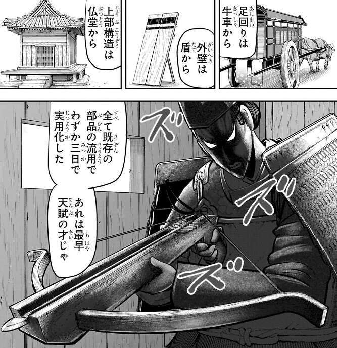 国司は頼重の軍に対して牛車、盾、仏堂の構造物を流用した巨大な「戦車」で対抗します。さらに弩(いしゆみ)を配備した私兵や、保科党の領地からさらった領民を盾に使い、頼重の軍に対抗しようとします。諏訪神党の三大将に市河軍を任せた保科党が頼重の軍と合流し、頼重と北条時行が自ら出陣、国司を倒して信濃の戦いを終わらせようとします。