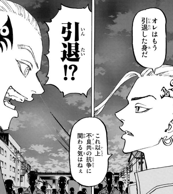 ドラケンが梵(ブラフマン)のメンバーと知り、武道はドラケンに梵(ブラフマン)に入った理由を聞こうと思います。しかし外に出てみると、ドラケンは明石 武臣と武道をスカウトした件について揉めていました。ドラケンは武道を梵(ブラフマン)にスカウトすることに反対ですが、それでも瓦城 千咒は武道を勧誘しようとします。