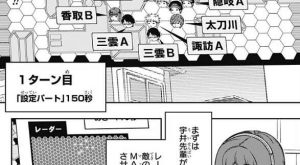 初日の順位で負けている諏訪7番隊は50点取るために攻めなきゃいけない立場だから難しいのでは?と、三雲は意見しますが、香取は「射撃連携」で攻めればいいと答えます。結局、次の時間まで時間がないので諏訪は香取の案を採用し、香取に出水ユニットを操作するように指示します。ぶっつけで新しい連携は……、と三雲は難しいと思いますが、「勝ち」への手がかりを集めよう、と前向きに考えます。