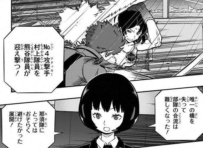 玉狛第2は三雲の作戦で、橋を雨取の砲撃で破壊し落とします。これで東岸の隊員と東側の隊員は合流できなくなり、西岸は玉狛第2の空閑 vs 那須隊の熊谷、日浦隊員 vs 鈴鳴第一の村上隊員の戦いの状況になりました。まずは橋付近で熊谷隊員と村上隊員が近接戦闘を始めます。